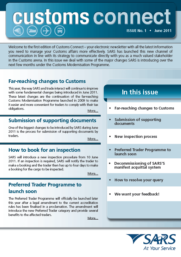 SARS has just introduced a new communication medium directed specifically for external stakeholders. It is called ‘Customs Connect’. Given the ever increasing need for public awareness and outreach in regard to on-going developments in the Customs Modernisation Programme, it is necessary to expand the scope of information to as wide an audience as possible. SARS encourages all external parties (including trade associations) in the local and regional trade community to read and circulate this newsletter. It can be accessed through the Customs Modernisation webpage, and will bring regular updates on modernisation issues.