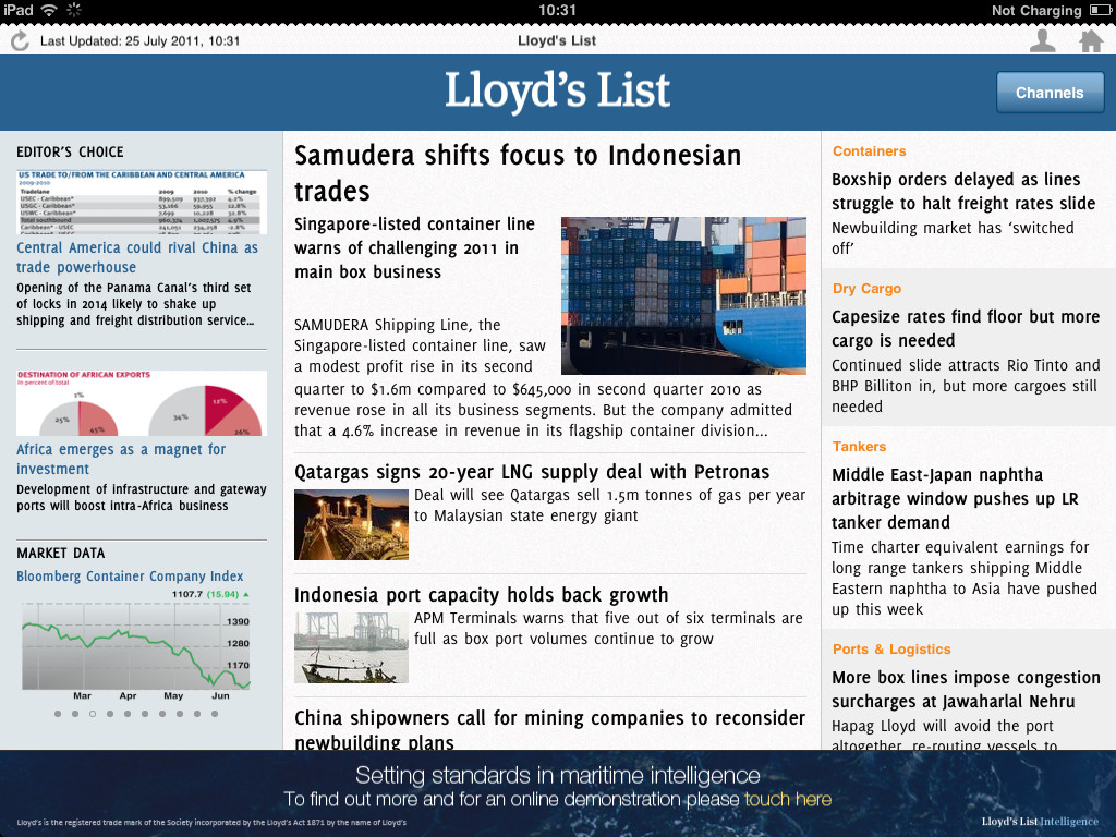 The Lloyd’s List App enables subscribers to access current news and market data anytime and anywhere. Once the news is uploaded, it is “cached” within the app, giving users the ability to read the latest headlines on the go without an internet connection. Stories are arranged in recency and categorised into channels Containers, Dry Cargo, Tankers, Ports & Logistics, Finance & Markets, Insurance, Ship Operations, and Regulation. Lloyd’s List subscribers can simply use their existing login details to access the new App. The App is free to download and has been formatted in keeping with mobile devices while retaining the familiar feel of Lloyd’s List.
