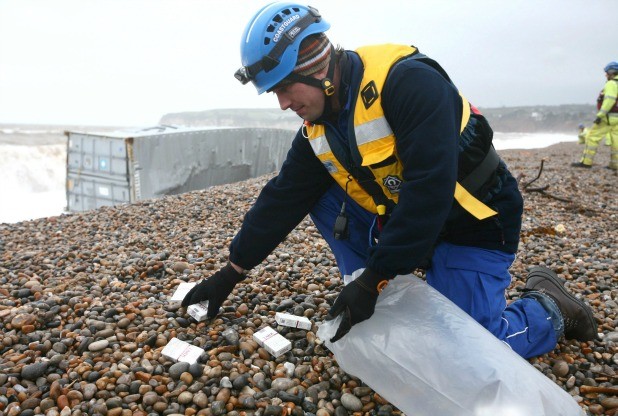A container, lost from a vessel in the Bay of Biscay, containing thousands of cigarettes has washed up on the pebble beach of Seaton in Devon. The battered container which spilled its contents over a wide area appeared early this morning (23/02/14) has now been cordoned off by Police. See SWNS story SWFAGS; Police have been forced to patrol a beach to warn off treasure hunters after a huge shipping container washed up – filled with a MILLION cigarettes. The 40 foot long box – which contains a tempting 14 tonnes of fags – is just one of 517 washed off a cargo ship during storms in the Bay of Biscay earlier this month. It is thought the Danish container which is bobbing in shallow water at Seaton, Devon, could be the first of many to wash up on the Lyme Bay coast in the coming days. The Maritime and Coastguard Agency is arranging recovery of the Maersk container which landed in the early hours of yesterday (Sunday) but have been delayed by the high tide. Police officers who have cordoned off the beach have issued a stern warning to anyone hoping to pick up a free packet of soggy cigarette