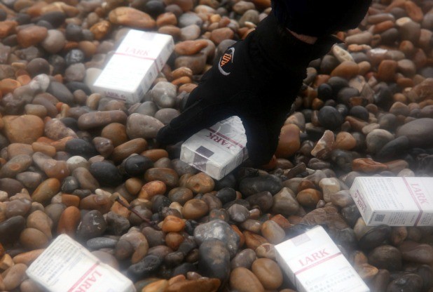 A container, lost from a vessel in the Bay of Biscay, containing thousands of cigarettes has washed up on the pebble beach of Seaton in Devon. The battered container which spilled its contents over a wide area appeared early this morning (23/02/14) has now been cordoned off by Police. See SWNS story SWFAGS; Police have been forced to patrol a beach to warn off treasure hunters after a huge shipping container washed up – filled with a MILLION cigarettes. The 40 foot long box – which contains a tempting 14 tonnes of fags – is just one of 517 washed off a cargo ship during storms in the Bay of Biscay earlier this month. It is thought the Danish container which is bobbing in shallow water at Seaton, Devon, could be the first of many to wash up on the Lyme Bay coast in the coming days. The Maritime and Coastguard Agency is arranging recovery of the Maersk container which landed in the early hours of yesterday (Sunday) but have been delayed by the high tide. Police officers who have cordoned off the beach have issued a stern warning to anyone hoping to pick up a free packet of soggy cigarette
