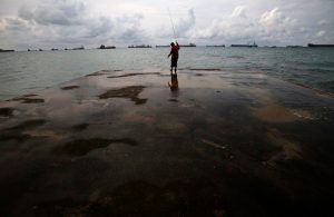 A man fishes on a wharf overlooking container ships anchored at sea, as they wait to berth at port terminals, in Singapore November 6, 2013. Connected to more than 600 ports in some 120 countries, Singapore is one of the world’s busiest shipping hubs, and is often called the gateway to Asia. It plans to increase its total capacity dramatically as it competes with other massive ports in the region such as Shanghai, Hong Kong and Shenzhen in China and Busan in South Korea. Picture taken November 6, 2013. REUTERS/Edgar Su (SINGAPORE – Tags: MARITIME BUSINESS SOCIETY)