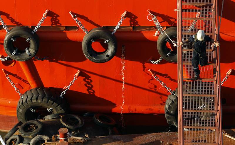 A worker disembarks a ship at a shipyard in Singapore July 10, 2013. Connected to more than 600 ports in some 120 countries, Singapore is one of the world’s busiest shipping hubs, and is often called the gateway to Asia. It plans to increase its total capacity dramatically as it competes with other massive ports in the region such as Shanghai, Hong Kong and Shenzhen in China and Busan in South Korea. Picture taken July 10, 2013. REUTERS/Edgar Su (SINGAPORE – Tags: MARITIME BUSINESS SOCIETY)