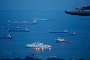 Ships anchor outside the harbour as they wait to berth at a port terminal, near the skydeck of the Marina Bay Sands hotel and casino, in Singapore July 17, 2013. Connected to more than 600 ports in some 120 countries, Singapore is one of the world’s busiest shipping hubs, and is often called the gateway to Asia. It plans to increase its total capacity dramatically as it competes with other massive ports in the region such as Shanghai, Hong Kong and Shenzhen in China and Busan in South Korea. Picture taken July 17, 2013. REUTERS/Edgar Su (SINGAPORE – Tags: MARITIME BUSINESS SOCIETY)