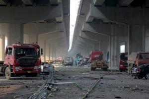 Damaged vehicles are seen under bridges close to the site of the explosions in Tianjin