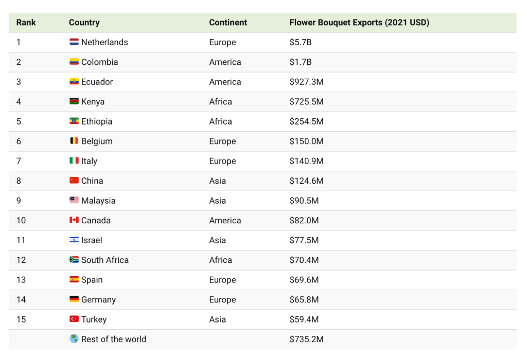 Far at the top of the list and best known for their tulips, the Netherlands dominated the flower bouquet export industry in 2021.