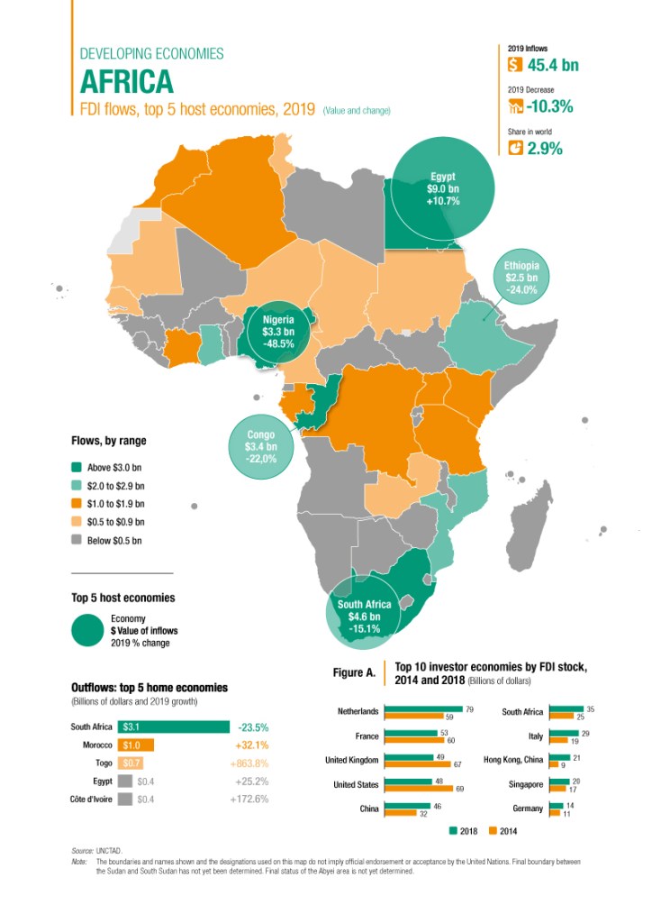 After a significant increase in 2018, FDI flows to Sub-Saharan Africa decreased by 10% in 2019 to $32 billion.