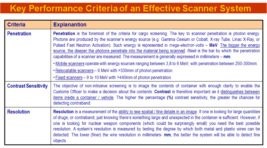 The security and detection industry is by its very nature an unregulated and to a large extent clandestine industry. In South Africa, government authorities were insistent on the local customs administration assessing and analysing this market and its developments to ensure that it procured equipment that would withstand the extreme conditions of the country’s varying climatic conditions; and moreover, manufacturer’s who would be able to not only maintain such equipment but also offer upgrades as the technology matured. A glimpse at any scanner supplier’s website is evidence enough – they are devoid of any specification, scant on description, therefore providing very little insight for a customs administration. Hence, when putting out a tender it is wise for a customs administration to request detailed specifications as part of the evaluation criteria. If necessary, the manufacturer must produce scientific and practical proof to support its claims.