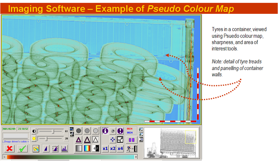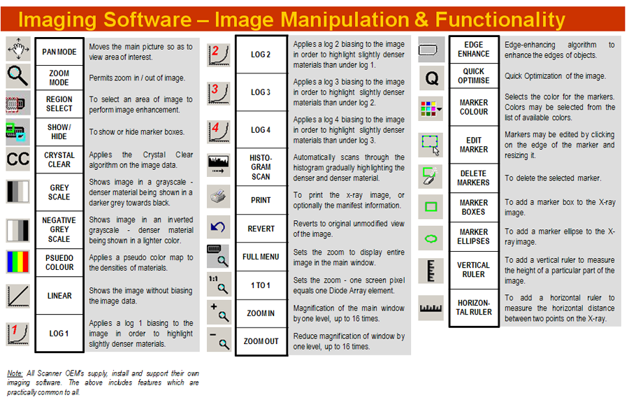 It is good to also understand a little bit about the radiographic image which the scanner system produces for the customs image analyst. Below are some examples of images derived from various imaging systems (gamma ray, backscatter x-ray, and linac x-ray) which demonstrate the versatility of non-intrusive inspection capability. First of all let’s have a look at the array of image manipulation tools offered by typical scanner imaging software: