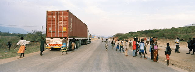 A truck leaves the border post at Machipanda to drive down the Beira Corridor, which links the port of Beira to Zimbabwe. This has always been a strategically crucial route for trade in Southern Africa. (The Guardian)