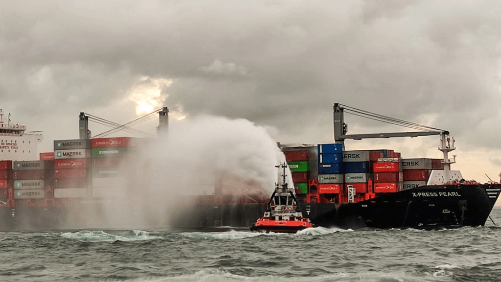 The fire on board the X-Press Pearl was first reported Thursday as the ship was awaiting entry to Colombo harbor at an offshore anchorage.